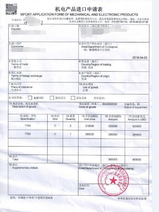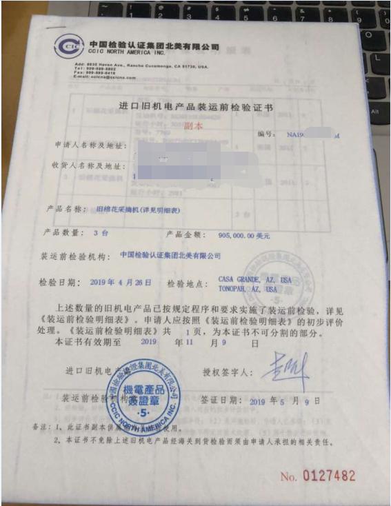 1.二手采棉机清关所需材料(购买发票,合同,装箱单,商检,普柜货物对应设备清单,中检证(进口旧机电设备装运前检验证书),收货人公司营执。机电产品进出口申请表。