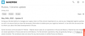 损失超7亿美元!马士基宣布全面退出俄罗斯和白据悉,马士基决定完全退出在俄罗斯的业务,这包括在俄罗斯境内外的服务以及在俄罗斯境内的资产(码头、仓库等),且不在俄罗斯和白俄罗斯开展任何新业务。 在俄乌冲突爆发不久后...查看详情 -